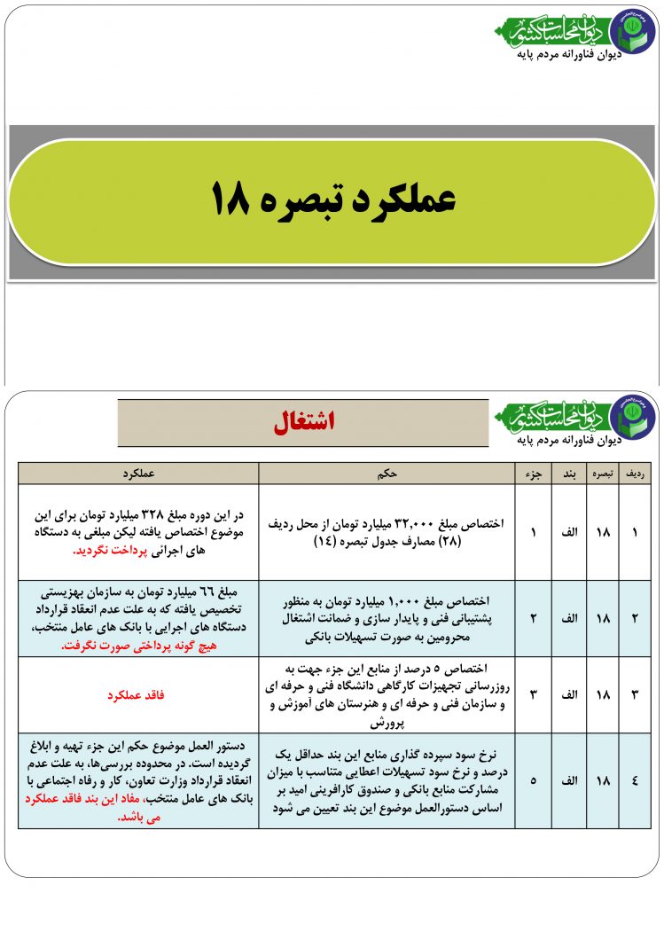براساس این گزارش از ۲۳ ردیف تبصره ۱۸ قانون بودجه سال جاری ۱۳ ردیف فاقد عملکرد بوده و در دیگر ردیفها نیز با وجود تخصیص بخشی از مبالغ، پرداختی صورت نگرفته است. به طور مثال مطابق بند (د) این تبصره به شرکتهای تابعه وزارت نفت اجازه داده شده است تا مبلغ ۸۰۰ میلیارد تومان از محل منابع داخلی خود را برای کمک به سرمایه گذاری خطرپذیر و حمایت از ساخت داخل و طرح های توسعه ای اشتغال آفرین و تولید بار اول اختصاص دهند که این بند فاقد عملکرد بوده و اجرایی نشده است.