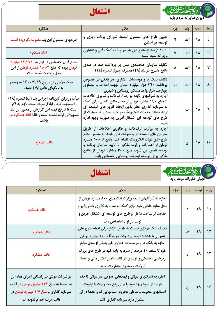 براساس گزارش کمیسیون ویژه جهش و رونق تولید و نظارت بر اجرای اصل ۴۴ قانون اساسی و توضیحات وزرای اقتصادی دولت مشخص شد، دولت دوازدهم در اجرای این تبصره بسیار ضعیف عمل کرده تا حدی که عملکرد منابع اشتغالزایی به ویژه با محوریت بند (الف) تبصره (۱۸) تنها حدود (۱۰) درصد میزان اشتغال هدف گذاری شده طی سالیان گذشته تحقق پیدا کرده است.