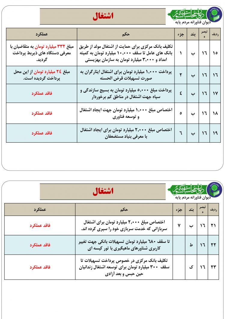 همچنین در جزء (۲) بند (الف) تبصره ۱۸ باید مبلغ ۱۰۰۰ میلیارد تومان به منظور پشتیبانی فنی و پایدارسازی و ضمانت اشتغال محرومین به صورت تسهیلات بانکی پرداخت انجام میشد، که با وجود تخصیص مبلغ ۶۶ میلیارد تومانی به سازمان بهزیستی، به علت عدم انعقاد قرارداد دستگاههای اجرایی با بانکهای عامل منتخب، هیچگونه پرداختی صورت نگرفته است.