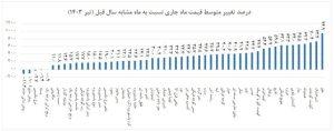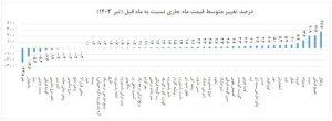 در این گروه، بیشترین افزایش قیمت نسبت به ماه قبل مربوط به «پرتقال» با ۲۷.۷ درصد، «سیب» با ۲۰.۹ درصد و «هندوانه» با ۱۳.۴ درصد و همچنین بیشترین کاهش قیمت مربوط به «هلو» با ۲۳.۵- درصد است.