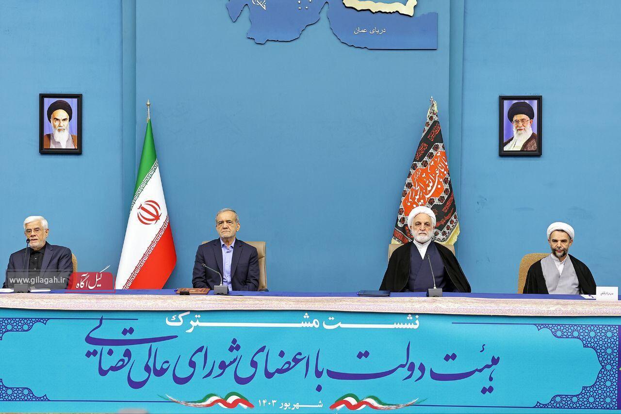 به گزارش پایگاه خبری و اطلاع رسانی گیل آگاه، دکتر مسعود پزشکیان امروز چهارشنبه در نشست مشترک اعضای هیات دولت و اعضای شورایعالی قضایی که به مناسبت هفته دولت برگزار شد، با گرامیداشت یاد شهدای دولت به خصوص شهیدان رجایی، باهنر و رئیسی، از نظرات و دیدگاههای مطرح شده در این جلسه، به ویژه سخنان حجتالاسلام والمسلمین محسنی اژهای قدردانی و دغدغههای مطرح شده را مسئله و دغدغه مشترک همه کارگزاران نظام دانست که باید با همدلی و همکاری آنها را دنبال و مرتفع کرد.