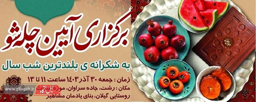 به گزارش پایگاه خبری و اطلاعرسانی گیل آگاه، ولی جهانی گفت: به مناسبت گرامیداشت آیین شب یلدا به عنوان میراث ناملموس بین المللی، مراسمی با حضور هنرمندان و مردم ساعت ۱۱ تا ۱۳ روز جمعه ۳۰ آذر ۱۴۰۳ در موزه میراث روستایی گیلان واقع در رشت، جاده سراوان برگزار میشود.