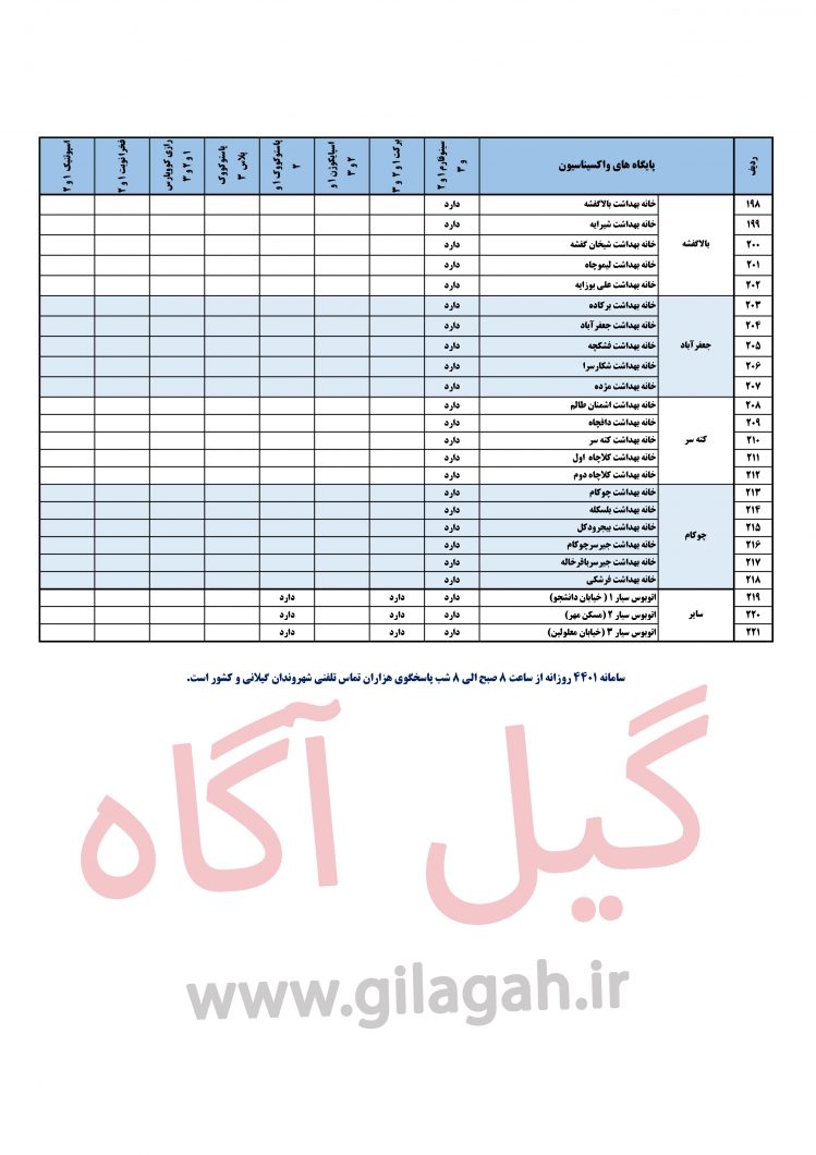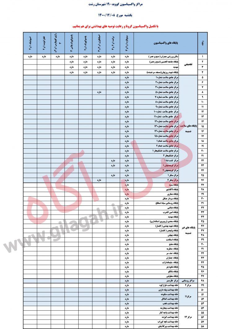 به گزارش پایگاه خبری و تحلیلی گیل آگاه؛ لیست مراکز واکسیناسیون شهرستان رشت در یکشنبه ۸ اسفند ماه ۱۴۰۰ به شرح زیر است: