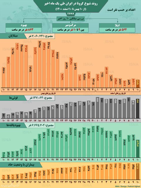 به گزارش پایگاه خبری و تحلیلی گیل آگاه؛ طبق اعلام وزارت بهداشت، ویروس کرونا تا ظهر سهشنبه (۱۰ اسفند ۱۴۰۰) هفت میلیون و ۶۰ هزار و ۷۴۱ نفر را در ایران به طور قطعی مبتلا کرده و در مجموع تا این روز ۱۳۷ هزار و ۶۴ نفر را به کام مرگ کشانده است. از سوی دیگر، شش میلیون و ۶۶۵ هزار و ۷۰۲ نفر در ایران تاکنون بهبود یافتهاند. بررسی آمارهای وزارت بهداشت نشان میدهد که طی ۱۰ روز اخیر (۲۵ بهمن تا ۴ اسفند ۱۴۰۰) به طور متوسط هر ساعت ۵۶۴ نفر در ایران مبتلا و بین ۹ تا ۱۰ نفر قربانی کرونا شدهاند و در هر ساعت ۸۶۳ نفر نیز بهبود یافتهاند. در این اینفوگرافیک روند شیوع کرونا در ایران طی یک ماه اخیر (از ۱۰ بهمن تا ۱۰ اسفند) را مشاهده میکنید.