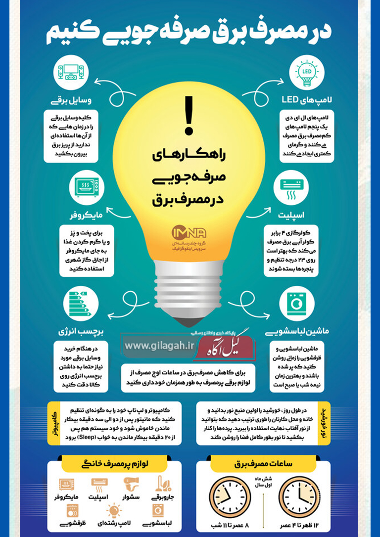 به گزارش گیل آگاه، اینفوگرافی راه های مصرف بهینه برق در مصارف خانگی در تصویر زیر بخوانید.