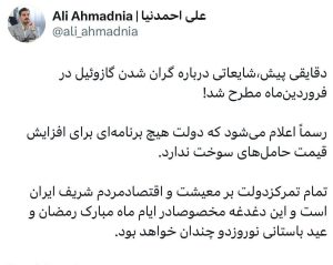 علی احمدنیا، رئیس امور اطلاعرسانی دولت در صفحه شخصی خود در شبکه اجتماعی ایکس نوشت: “دقایقی پیش، شایعاتی درباره گران شدن گازوئیل در فروردینماه مطرح شد! رسماً اعلام میشود که دولت هیچ برنامهای برای افزایش قیمت حاملهای سوخت ندارد. تمام تمرکز دولت بر معیشت و اقتصاد مردم شریف ایران است و این دغدغه مخصوصا در ایام ماه مبارک رمضان و عید باستانی نوروز دوچندان خواهد بود.”