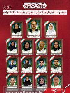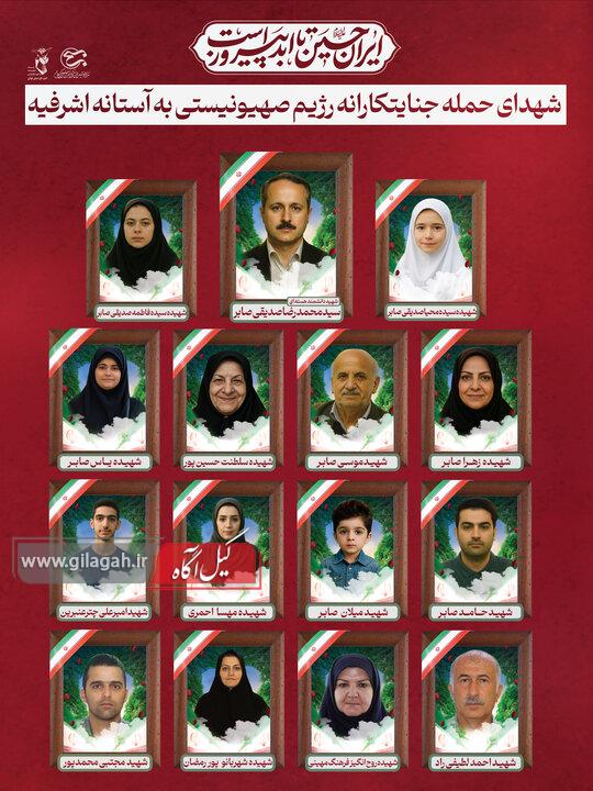 به گزارش پایگاه خبری و اطلاع رسانی گیل آگاه،بنیاد شهید گیلان اسامی ۱۵ شهید تجاوز رژیم صهیونیستی به مناطق مسکونی آستانه اشرفیه را اعلام کرد: سید محمد رضا صدیقی صابر» شهید دانشمند هستهای، «شهیده سیده محیا صدیقی صابر»، «شهیده سیده فاطمه صدیقی صابر»، «شهیده زهرا صابر»، «شهید موسی صابر»، «شهیده سلطنت حسین پور»، «شهیده یاس صابر»، «شهید حامد صابر»، «شهید میلان صابر»، «شهید مهسا احمری»، «شهید امیر علی چتر عنبری»، «شهید احمد لطفی راد»، «شهیده روح انگیز فرهنگ مهینی»، «شهیده شهربانو پور رمضان»، «شهید مجتبی محمد پور» پیکرهای مطهر شهیدان حمله و تجاوز تروریستی رژیم کودک کش و گرگ صفت صهیونیستی در آئینی باشکوه عصر فردا (ساعت ۱۶) در میدان شهدای ذهاب رشت که میعادگاه شهیدان و ایثارگران هشت سال دفاع مقدس گیلان است، با حضور مردم قدرشناس و شهیدپرور تکریم میشود و تشییع میشوند.