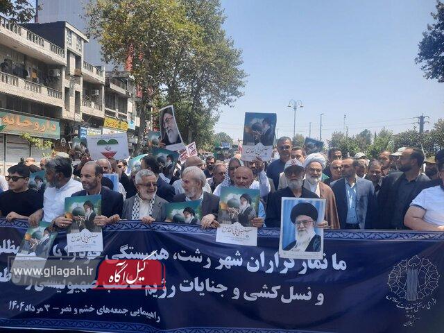 نمازگزاران ولایتمدار دیار میرزا کوچک جنگلی با حضور پرشور خود در این راهپیمایی، جنایات وحشیانه رژیم صهیونیستی در نوار غزه و حامیان استکباری این رژیم غاصب بهویژه آمریکای جنایتکار را به شدت محکوم کردند. همچنین مردم شریف با سر دادن شعارهای «مرگ بر اسرائیل» و «مرگ بر آمریکا»، نفرت و انزجار خود را از ظلم و ستم اشغالگران قدس به نمایش گذاشتند.