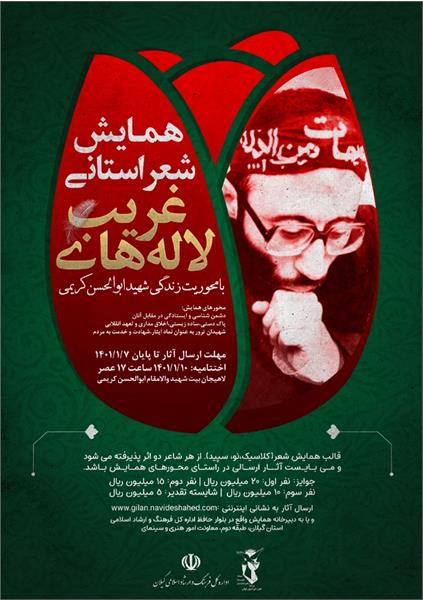 وی با بیان اینکه اختتامیه این جشنواره دهم فروردین ساعت ۱۷ عصر در بیت شهید ابوالحسن کریمی در لاهیجان برگزار میشود اعلام کرد: علاقمندان به شرکت در همایش «لالههای غریب» باید آثار خود را به آدرس اینترنتی https://gilan.navideshahed.com و یا دبیرخانه همایش واقع در رشت، خیابان حافظ، اداره کل فرهنگ و ارشاد اسلامی گیلان، طبقه دوم، معاونت امور هنری و سینمایی ارسال کنند.