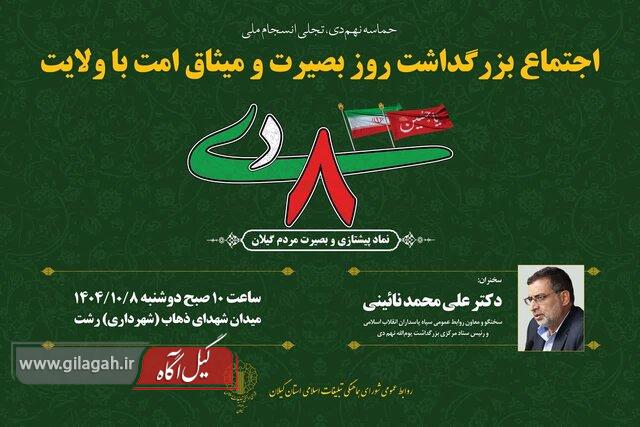 به گزارش پایگاه خبری و اطلاع رسانی گیل آگاه l با عنایت به پیشتازی گیلانیان غیور و انقلابی در خلق حماسه ماندگار هشتم دی و حضور یک روز زودتر در صحنه مبارزه با فتنه ۸۸ و حمایت از ولایت فقیه، اجتماع بزرگداشت روز بصیرت و میثاق اُمت با ولایت در شهر رشت، ساعت ۱۰ صبح روز دوشنبه، ۸ دی ۱۴۰۴ در میدان شهدای ذهاب (شهرداری) با سخنرانی سردار دکتر علیمحمد نائینی، سخنگو و معاون سپاه پاسداران انقلاب اسلامی و رئیس ستاد مرکزی بزرگداشت یوم الله نهم دی برگزار میگردد.
