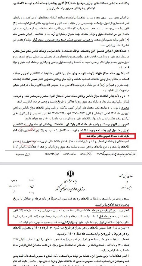 بخشنامه سازمان اداری و استخدامی کشور در اجرای دستور رئیسجمهور مبنی بر شفافسازی اطلاعات پرداخت کارکنان دستگاههای اجرایی کشور نوزدهم اردیبهشت صادر شده بود.