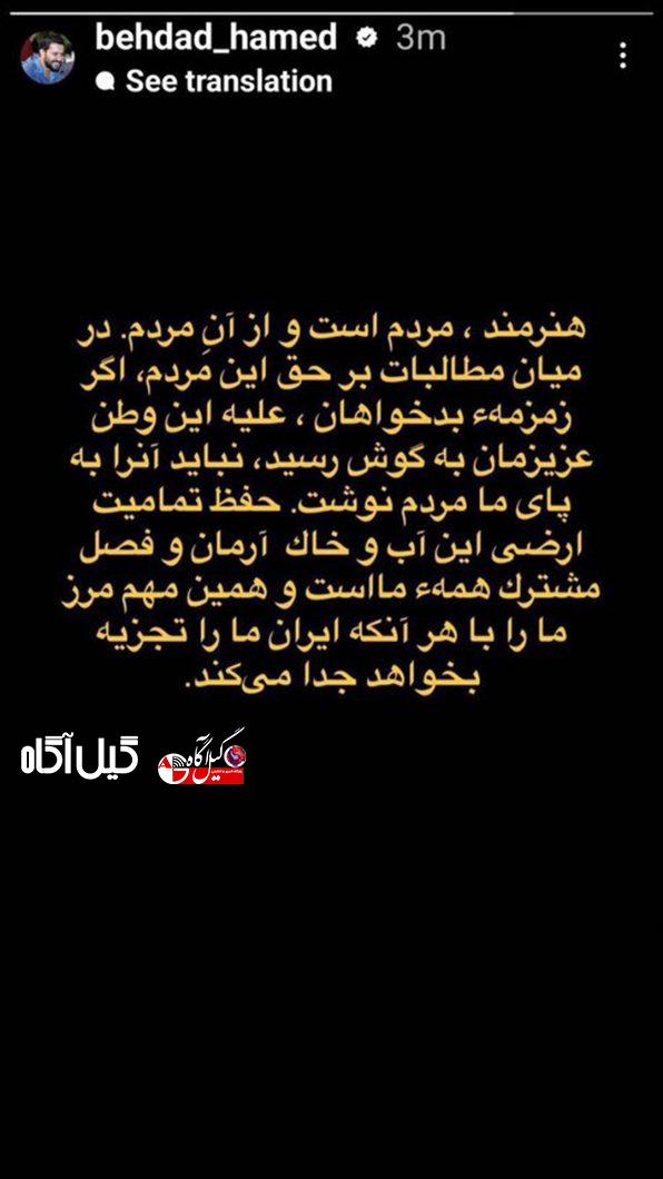 پایگاه خبری و اطلاع رسانی گیل آگاه l حامد بهداد در تازهترین واکنش خود به اتفاقات اخیر در استوری اینستاگرام خود نوشت: هنرمند، مردم است و از آنِ مردم. در میان مطالبات بر حق این مردم، اگر زمزمه بدخواهان علیه این وطن عزیزمان به گوش رسید نباید آن را پای ما مردم نوشت.