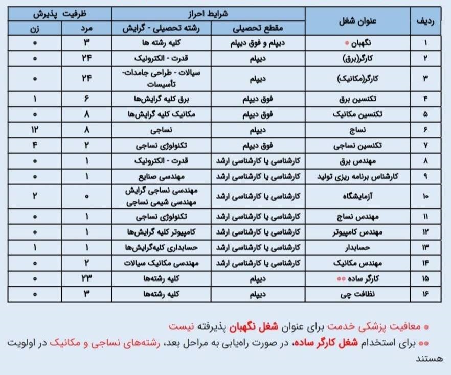 مهرورز؛ نگهبانی، کارگر (برق و مکانیک) ، تکنسین برق ، تکنسین مکانیک، نساج، تکنسین نساجی، مهندس برق، کارشناس برنامه ریزی تولید، آزمایشگاه، مهندس نساجی، مهندس کامپیوتر، حسابدار، مهندس مکانیک، کارگر ساده و نیروی خدماتی را ۱۶ عنوان شغلی مورد نیاز طبق شرایط احراز از مقاطع تحصیلی دیپلم، فوق دیپلم، لیسانس و فوق لیسانس برای جذب این آزمون براساس جداول زیر برشمرد.