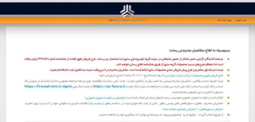به گزارش پایگاه خبری و اطلاع رسانی گیل آگاه به نقل از فارس، طبق اطلاعیههای قبلی مقرر بود شرکت خودروسازی سایپا از ساعت ۱۴ روز سهشنبه ۴ بهمن از طریق سایت ثبتنام خودرو به آدرس https://saipa.iranecar.com ثبتنام متقاضیان خودرو در طرح عرضه فورس محصولات خود را انجام دهد.