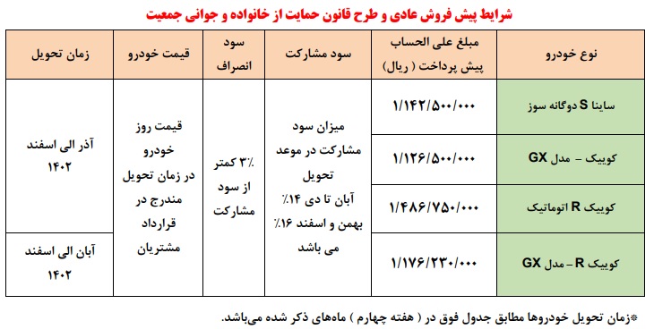 این طرح از صبح روز سهشنبه هفته جاری ( ۱۰ صبح دوم اسفند ماه) آغاز شده و برای متقاضیان عادی تا زمان تکمیل ظرفیت و برای مادران دارای ۲ فرزند و بیشتر به مدت ۳ روز ادامه خواهد داشت. متقاضیان میتوانند با مراجعه به سایت فروش گروه خودروسازی سایپا به نشانی اینترنتی saipa.iranecar.com در موعد مقرر نسبت به ثبتنام اقدام کنند.