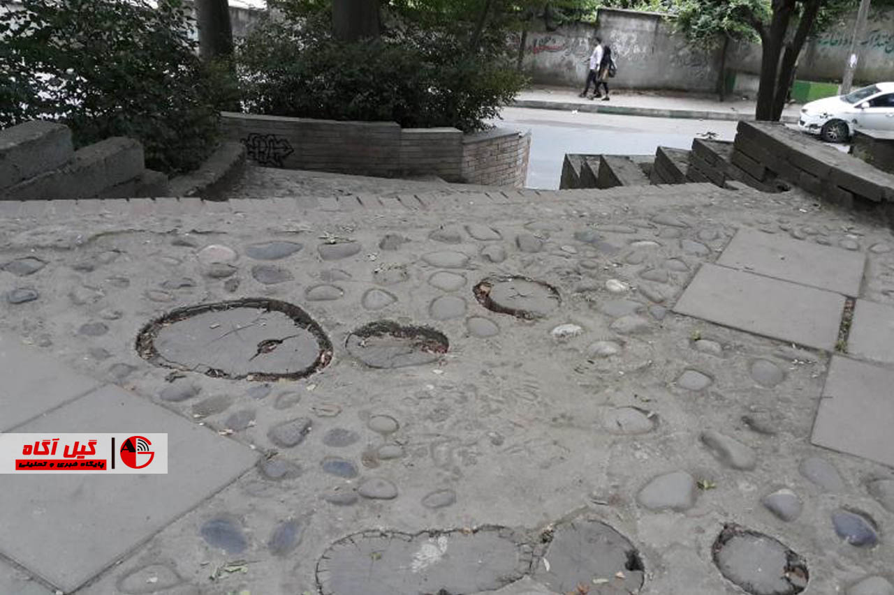 نزدیک به اگوهای فاضلاب، برخی از درختان آفتزده و پوسیده قطع شده است. راههای بتنی، تنه چند اصله درخت را احاطه کرده است و در بسیاری از بخشها، سیمان در بن محیط درختان ریخته شده است. خوشبختانه چند اصله درخت نارنج –که در میانه باغ قرار دارد و در اردیبهشت ماه با شکوفههای خود، تمام محله را معطر میکند- باقی است و اطراف آن بازپیرایی و علفهای هرز آن کنده شده است.