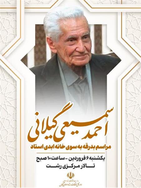 به گزارش پایگاه خبری و اطلاع رسانی گیل آگاه ، مراسم بدرقه استاد احمد سمیعی گیلانی پدر ویراستای نوین ایران، چهره ماندگار در رشته ادبیات و عضو پیوسته فرهنگستان زبان و ادب فارسی به سوی خانه ابدی، فردا (یکشنبه ۶ فروردین ماه ۱۴۰۲) از ساعت ۱۰ در تالار مرکزی رشت برگزار می شود.