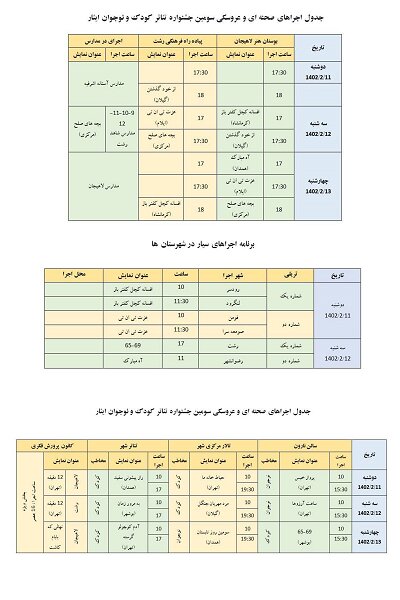 وی با تاکید بر اینکه تمامی اجراها برای عموم رایگان است، بیان کرد: اجراهای صبح ویژه مدارس و جلسات نقد و بررسی نیز هر روز ساعت ۱۸ عصر در تالار مرکزی شهر برگزار خواهد شد.
