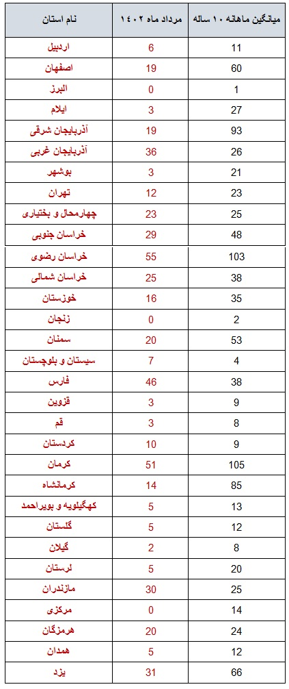 براساس این گزارش، استان خراسان رضوی با ۵۵ زمینلرزه ثبت شده دستگاهی بالاترین آمار زمینلرزه ثبت شده در مردادماه ۱۴۰۲ را به خود اختصاص دادهاست و پس از آن استانهای کرمان و فارس به ترتیب با ۵۱ و ۴۶ زمینلرزه قرار دارند.